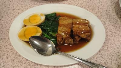 夕食はPM6時30分からでした。中華料理の夕食とのこと。メインディッシュは東坡肉やエビチリ等、3皿でした。量は多くありません。
