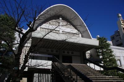 本堂はコンクリート造のユニークな形。シェル構造でしょうか。