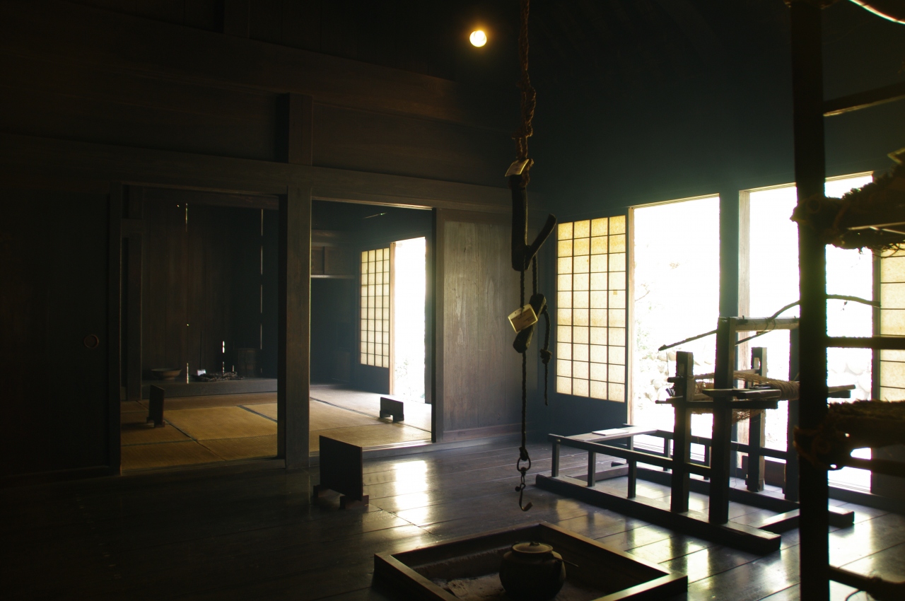 古民家のかまど、流し、食器棚、生活用の道具、囲炉裏等、楽しく見物しました。柱の手触りも良かった。