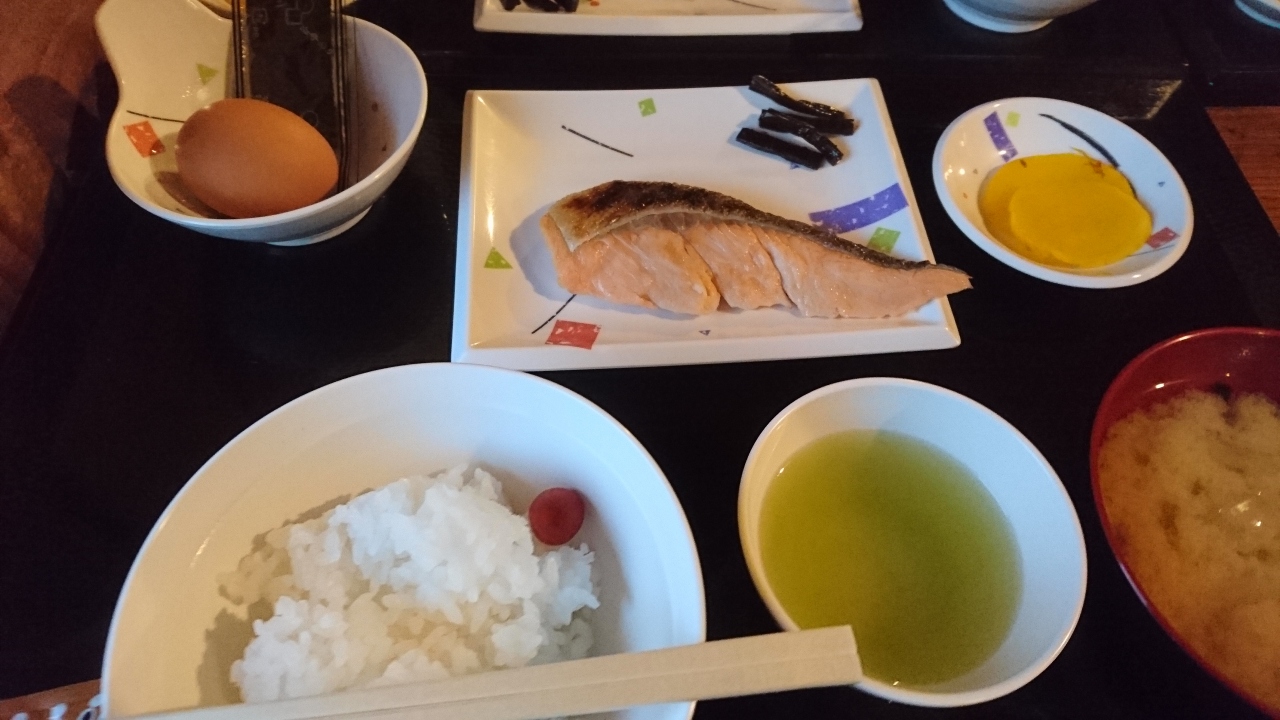 朝、4時45分頃、日の出を拝み、その後、朝食を頂きました。朝食のご飯はおいしく炊けていました。生卵、焼き鮭等の朝食、おいしかった。