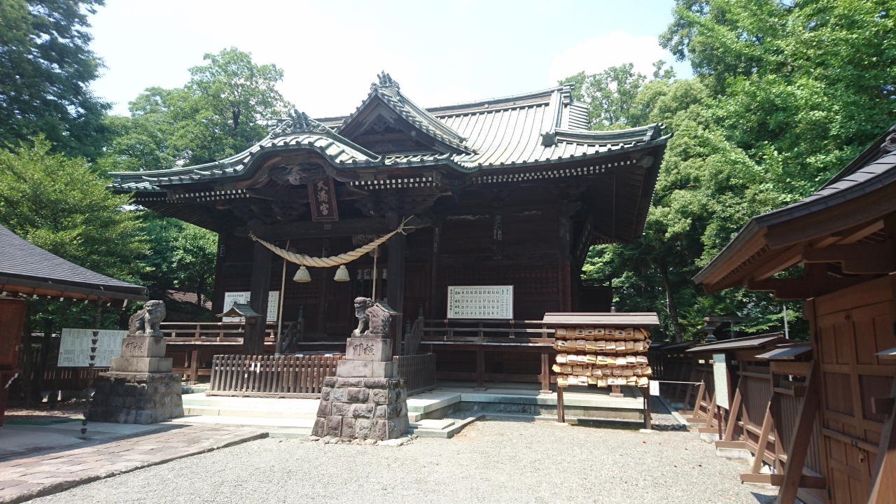 社殿の奥に先端が鉛直の千木と鰹木の有る屋根が有ります。社殿の隣に大きなイチョウの御神木が生えています。イタズラしないようにしましょう。
