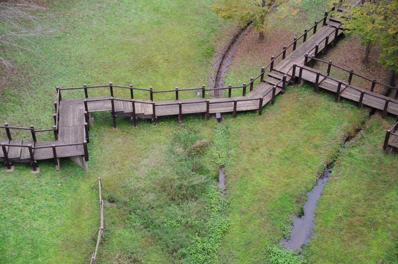 橋の下に「やすらぎの池」が有ります。人工の池のようですが、自然の地形のように見えます。湿地のようになっており、湿地を渡る木製の道が有ります。