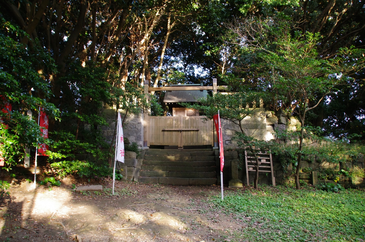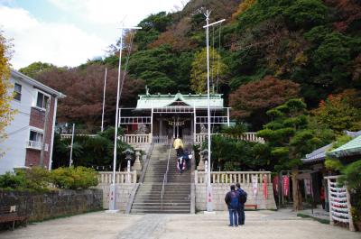 入江に面しており、荒天時には波しぶきが掛かりそうな神社です。石段を上り、参拝しました。源頼朝公に因む神社だそうです。社殿に縦千木と鰹木が載っています。