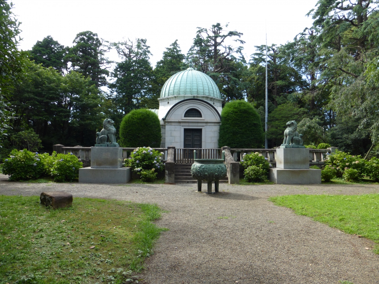 静嘉堂緑地の中央に岩崎家の廟が有ります。岩崎弥之助氏の納骨堂だそうです。青銅葺ドーム屋根のこの廟はなんと、ジョサイア コンドル氏の設計によるものだそうです。コンドル氏は鹿鳴館の設計者であり、東京駅の辰野金吾氏の先生。こんなお墓、他に無いと思います。さすが、岩崎家。- 旅行時期