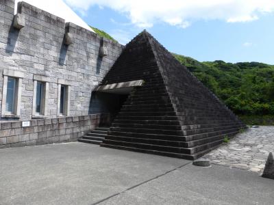 新島特産のコーガ石のピラミッドのようなものが入り口ちなっています。入館料は300円でした。