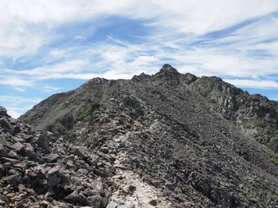肩ノ小屋から上は緩やかです。この辺りから雲ってきました。谷川岳は双耳峰であり、トマノ耳とオキノ耳の2つの頂が有ります。頂上はオキノ耳です。