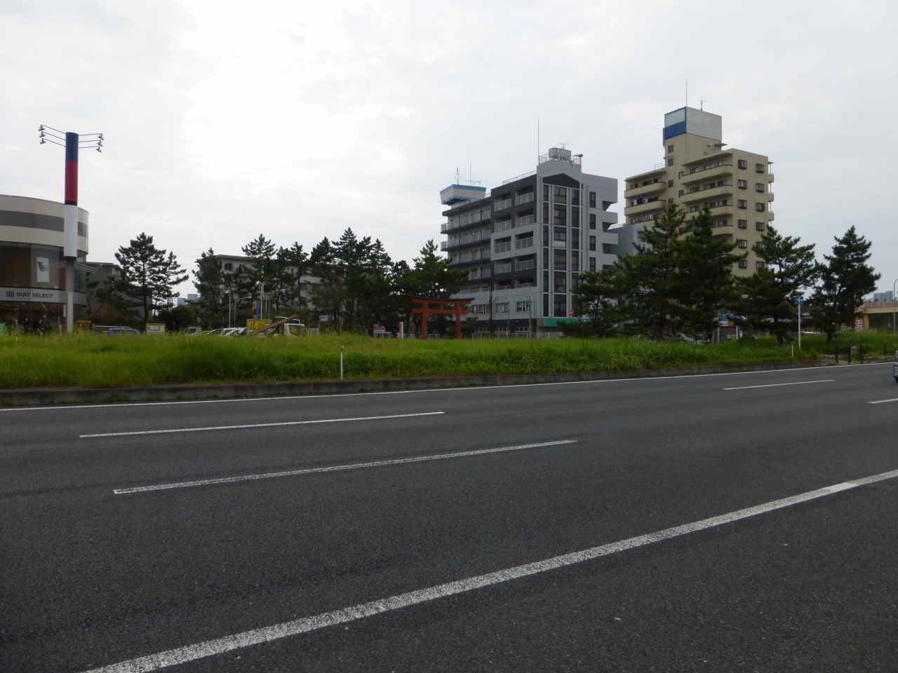 ここの千葉街道の南西側に赤い鳥居が立っています。一の鳥居であり、かつてはこれが海上に有りました。千葉街道の辺りが海岸線だったそうです。