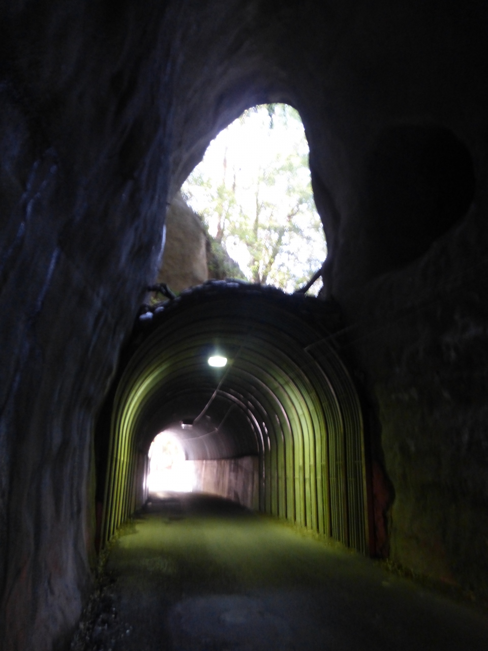 向山トンネルが素掘りの鋭角の三角断面で、共栄トンネルが鋼製の半円筒断面。この2つが繋がっており、断面が2階建てに見えます。