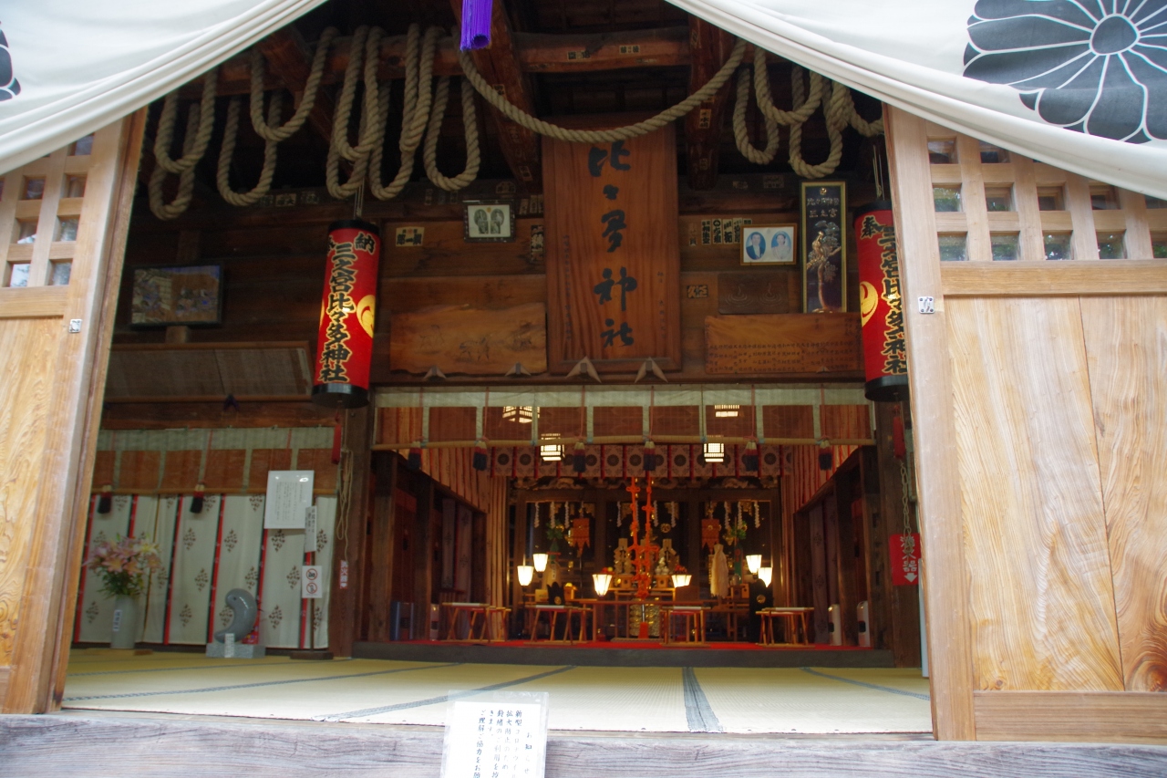 御嶽(みたけ)山がご神体であり、本殿が無いそうです。木の鳥居を潜り、囲いの中に入りました。神秘的なものを感じました。拝殿へお参りしました。奥に中門が有り、その向こうが山です。本殿が無いので、多宝塔が寄進されたのかな。- 旅行時期