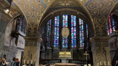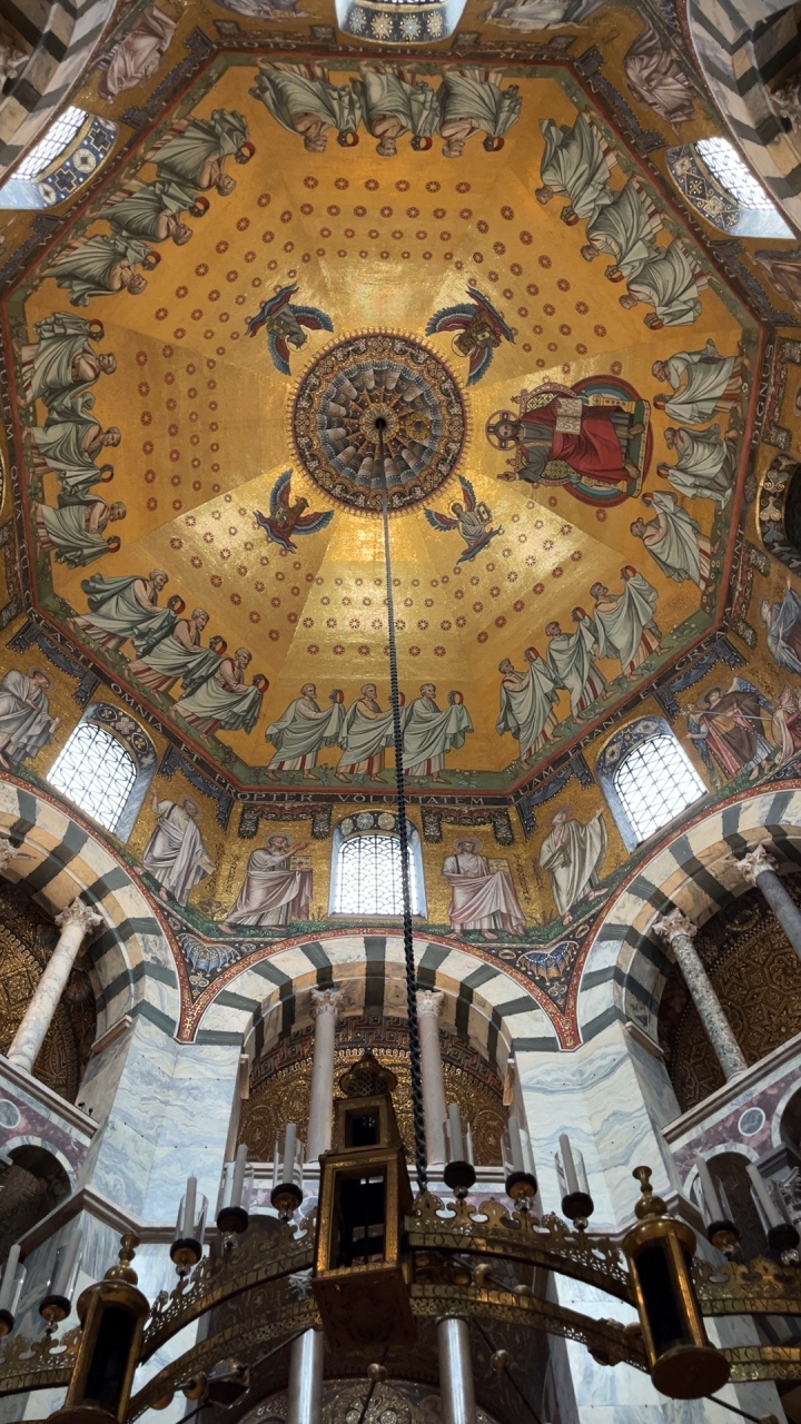 アーヘン駅から徒歩15分。8角形をした大聖堂で、主祭壇の周りにも廊下がある造りです。内部は金色のモザイクで細かく装飾されていて、扉をあけて入った瞬間にその豪華さに圧倒されます。天井から床、柱まで、とにかく荘厳の一言で、ケルンなどの大聖堂などとは異なる趣を放っています。