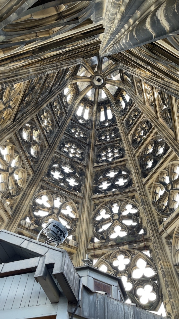 大聖堂を出て左側、階段を下りたところにトイレとチケット売り場あり。そこから延々と階段を上ります。塔の中はらせん階段になり、かなり体力がないときつい。のぼりとくだりがすれ違うのは結構大変なくらい狭いです。途中外の景色が見える小窓が何カ所かあり、大鐘を見ることもできます。終点近くはらせん階段ではなく非常階段のような広い階段をのぼります。塔からの景色はととても素晴らしく、ライン川やケルンの街が一望できます。正味1時間もあれば上って下りて来れると思います。