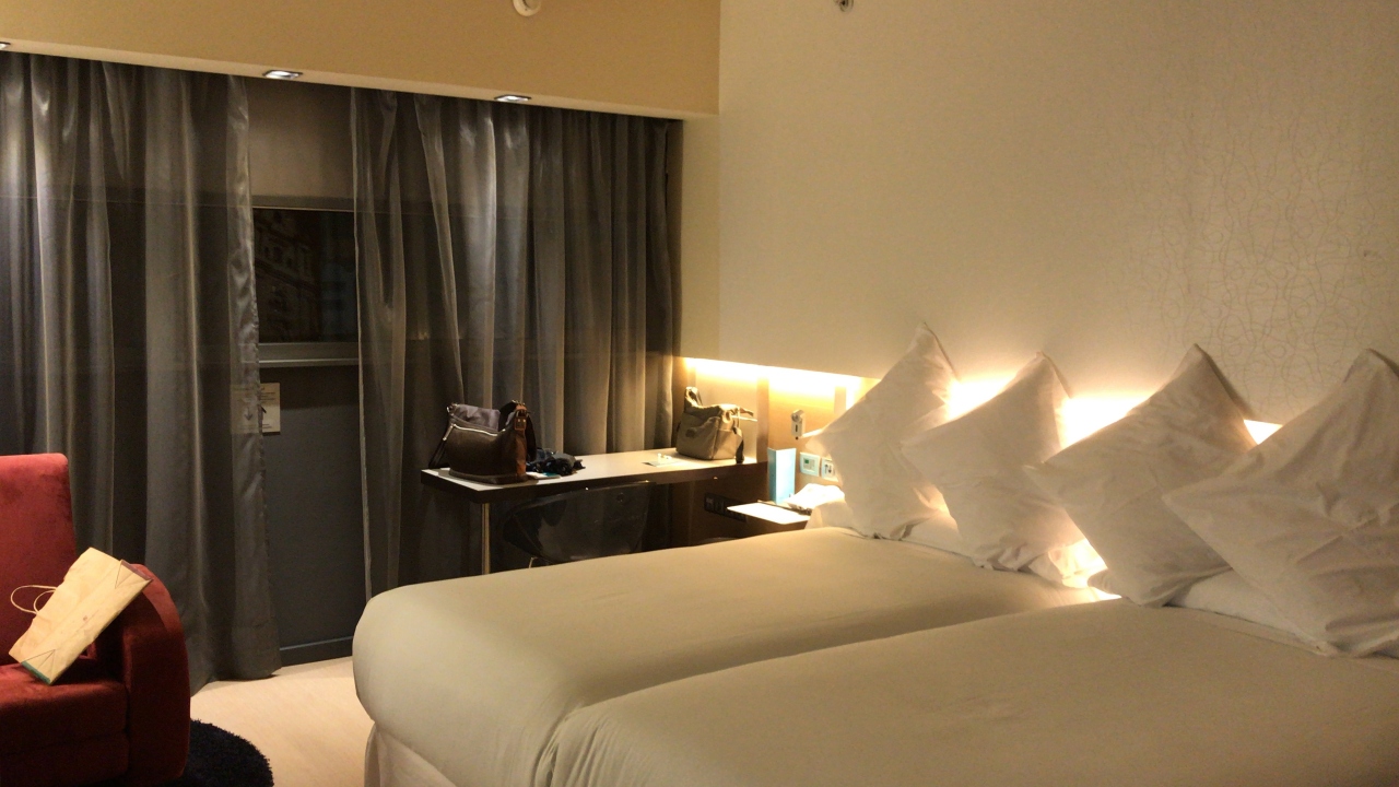 5月に1泊朝食付124ユーロで泊まれました。部屋はツインで広さもまあまあ、とても清潔でベッドの寝心地もよかった。湯量、排水ともに問題なく、快適でした。駅ビルのホテルなので、静かでしたが眺めはよくはありません。朝食はビュッフェスタイルで結構豪華でした。甘くておいしいオレンジジュースや、ハム、卵、暖かいおかず、豊富なパン類など迷ってしまうほど。特に菓子パンがおいしかった。ここの1番の特筆ポイントはその立地です。空港からRENFE近郊線Linea C1で1駅め、およそ8分のMalaga Maria Zambrano駅直結なのです。この近郊線、1時間に3本出ています。切符も自販機で簡単に購入できます。正確には覚えていませんが、1人1.6ユーロ程度だったと思います。改札から右手の方に進むと「ホテル」の表示があり、そのまま行くとホテル入り口に至ります。また、ロンダなどに行くバスターミナルも、駅ビル内の案内に沿って歩いて数分で行くことができます。殆ど隣、ちょっと外にでてすぐです。あいにく雨でしたが、濡れずに行けたほどです。また、この駅ビルにはスーパーも入っており、軽くサンドイッチやサラダ、水など買うことができました(22時閉店)。フロントの感じもよかった。マラガの観光中心地までは歩いていけるそうです。