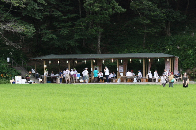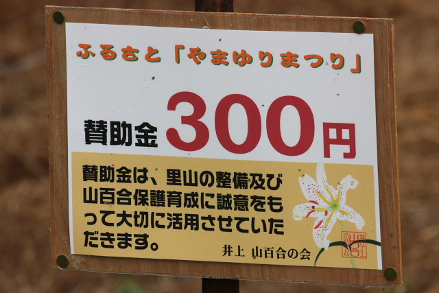 西蓮寺の駐車場に車を止めて、境内の横から田圃の方に下りていくと里山が見えてきます。里山に入る前に受付があり、「ふるさと山百合まつり」の期間は賛助金300円を徴収されますが、おもてなしの冷茶や山芋を御馳走してくれました。この里山は地域の皆さんが大切に手入れし、山百合の群生を守っているとの事です。