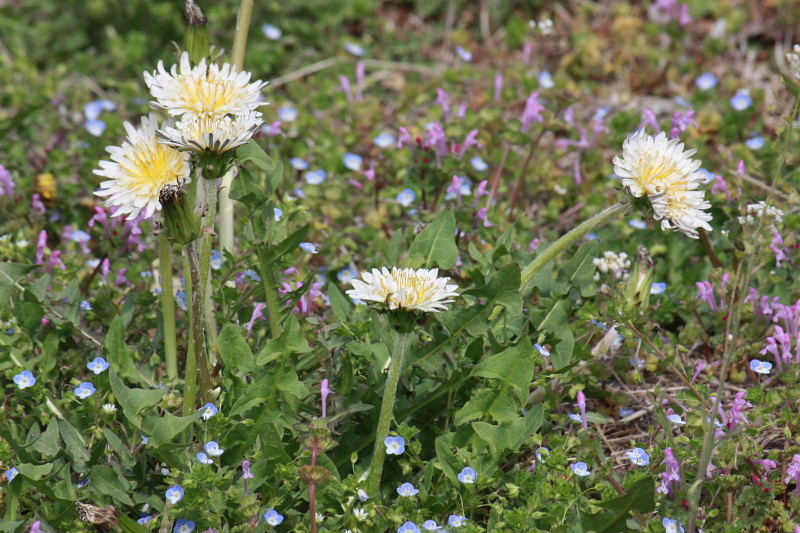 冬鳥のツグミや、関東では珍しい白花タンポポも見られました。