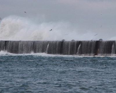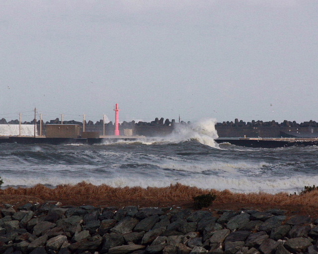 今日は海がだいぶ荒れていて、太平洋の荒波が堤防を乗り越えて港内に流れ込んでいました。