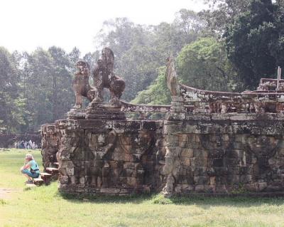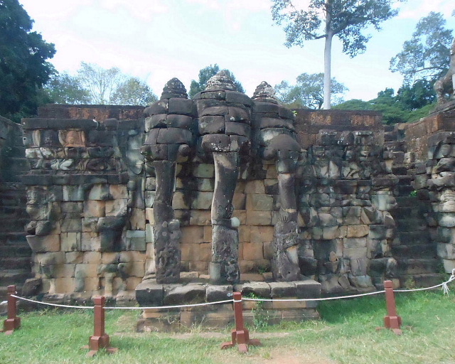 「象のテラス」は王宮前広場に面して南北方向に延々と続く長大なテラスの呼び名である。十二世紀後半、ジャヤヴァルマン七世によって作られ、王族の閲兵などに使われた。高さ三メートル、長さは三百メートル以上もあり、テラスの上にはナーガの欄干がある。側壁にはその名のとおり象のレリーフが見られる。レリーフの主題は主に象による狩の様子である。テラスの北側の側壁にはガルーダのレリーフがある。またテラスに付属する階段の両脇には、象の頭部を模した装飾がある。建築様式はバイヨン様式に属するそうです。