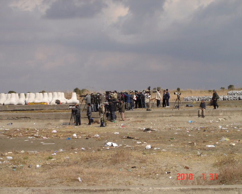 この海水浴場のはずれに、主に北海道に冬鳥として渡来する珍鳥ユキホオジロ♂が出ているとの情報を戴き、飛んでいきました。以前、日本野鳥の会東京支部(当時)に入会していた頃、ユキホオジロを見たくて冬の北海道探鳥ツアーに参加しましたが、その時は残念ながら見られませんでした。その後、石川県舳倉島で、ユキホオジロのメスを見ましたが、今回はユキホオジロのオスという事で初めての対面でした。現地には大勢のカメラマンが珍鳥を撮ろうと押しかけていました。念願かなって、オスのユキホオジロを見る事ができ、大満足な日帰り旅行となりました。