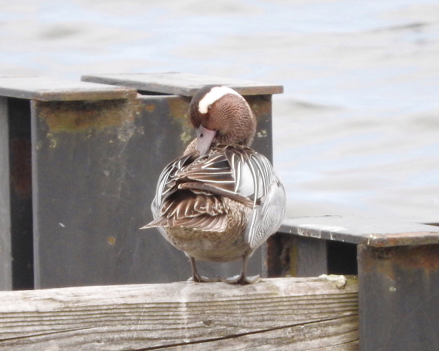 北浦湖岸はコンクリート護岸工事で緑が少なくなったので、植生保護の為に石積ブロックの消波堤や、木の杭を打って作った消波堤(今は腐食して壊れています)などがあり、鴨等の塒になっています。私達が訪れた時は、この木の杭の上で、長旅の疲れを癒していました。他にも、コガモやカルガモ、ヨシガモなど多くの鴨類も見られました。- 旅行時期