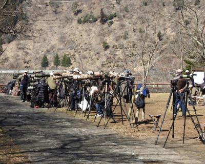 小河内ダムを渡って対岸の奥多摩湖いこいの路を目指して歩きます。ダムを渡り終えると小さな公園のような広場があり、すでに80名程のカメラマンが待機していました。あのバズーカ砲のような超望遠レンズのカメラがずらりと並んでいます。後から来た人は割込むスペースも無い程です。隣りの人にヤマヒバリが出ているか聞いた所、8時頃に一度出たとの事、期待が持てます。本命のヤマヒバリが出る迄、前座に出てくるマヒワやエナガ、ツグミ、カヤクグリなどを撮影して時間潰しをします。9時半頃、待望のヤマヒバリが出ました。私は、ヤマヒバリはバードウォッチング歴20年余にして初めてお目にかかる珍鳥です。初めは警戒して藪の陰で採餌していましたが、徐々に藪から出てきました。周囲のカメラから一斉に軽機関銃のような連射のシャッター音が鳴りひびきます。ヤマヒバリはすぐに藪に隠れてしまいましたが、しばらくして、また藪から出てきました。午前中に3回、隠れたり出たりを繰り返してから山の方に飛んで行きました。何とか証拠写真も撮れたので、満足して奥多摩湖を後にしました。- 旅行時期