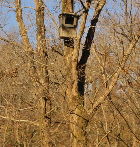 最近は、どこでもフクロウが営巣できるような空洞のある大きな老木が少なくなりました。その為に、水郷県民の森では、フクロウが地面近くの切株の空洞に産卵するという事があり、翌日には天敵に襲われて卵を食べられるという事件がありました。それを見かねて、野鳥の会の会長さんがフクロウの巣箱を作りました。ベニヤ板では巣箱が重くなりすぎて素人では設置困難だというので、プラスチック製のゴミ箱を改造して巣箱を作ったそうです。それを友人たちが協力して、県民の森でフクロウが産卵した付近の樹木に取り付けましたが、巣箱が大きいので大変でした。