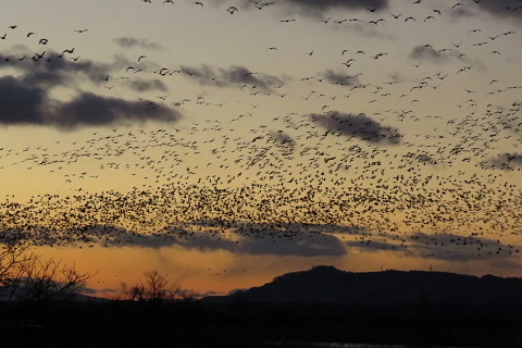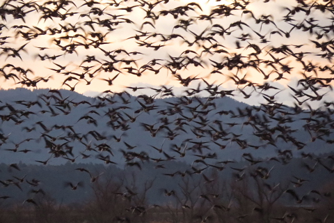 - 朝のマガンの一斉飛び立ちは迫力満点