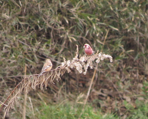 今回はベニマシコが番いで出てくれました。ベニマシコは珍鳥というほどではありませんが、平野部や都市部ではあまり見られない赤い鳥の代表選手です。