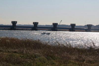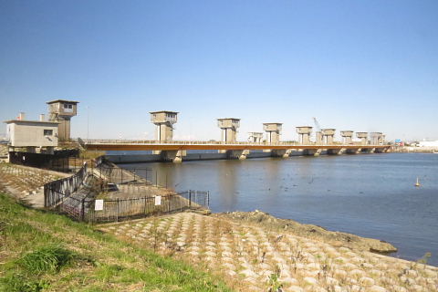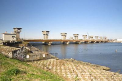 利根川河口堰は、茨城県神栖市と千葉県香取郡東庄町の間を流れる利根川と常陸利根川にかかる河口堰で、地元では逆水門と呼ばれています。一般に水門は、水路などで上流側から下流側への水の流れを堰き止める為に作られますが、この利根川河口堰は利根川の下流側から上流側へ海水を含んだ水が逆流しないように阻止する目的で設けられたので、逆水門と呼んでいます。何故、利根川が逆流するかというと、大潮などで海面水位が上昇すると、利根川の水位よりも海面水位が高くなって海水が利根川に逆流し、利根川から取水している水田で塩分による農作物の被害が発生するので、これを防ぐ目的で設置され、総延長約834mもあるそうです。