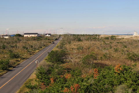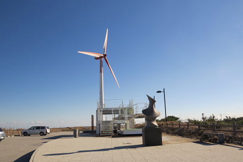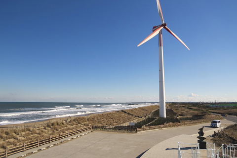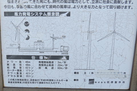 この波崎シーサイドパークは、風力発電風車見学施設として1998年12月より稼働しているそうです。風力発電機は、エコ先進国デンマークのNEG MICON社製の風力発電機で1基600Kw×2基で、更に北側に1基増設工事中でした。この波崎シーサイドパークの北側には、波崎ウインドファームという風力発電施設が2004年5月より稼働しており、その出力は1250Kw×12基だそうですから、それと比較するとずっと小さい発電施設ですが、設置された1998年当時は県内でも風力発電は珍しい施設でした。- 旅行時期