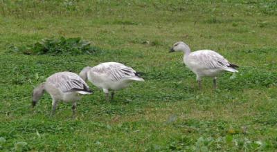 私も10数年前に宮城県の伊豆沼でハクガン成鳥1羽を見ましたが、それ以来の再会でした。幼鳥の為か、ほとんど見物人を怖がらず、カメラマンが10数m位迄近づいても逃げません。むしろ、ハクガンが夢中で餌(雑草)を食べながらカメラマンに近づいてくるので、超望遠レンズを装着したカメラマンは、近すぎてピンボケになるので逃げまわっていました。その様子を周りの見物人が笑いながら見ているというほほえましい光景でした。