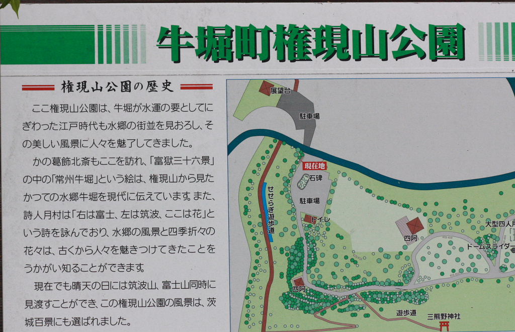 権現山公園は、潮来市牛堀にある公園で、「茨城百景」にも選ばれた桜とつつじの名所です。展望台からは北利根川沿いに広がる水郷地帯や霞ヶ浦が一望できます。江戸時代には牛堀河岸のシンボルとして、大きな黒松や桜が航行する舟の目印となっていたそうです。江戸時代後期に活躍した浮世絵師である葛飾北斎の富嶽三十六景「常州牛堀」がこの場所より描かれたといわれています。