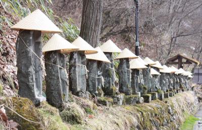 私達は、ホテル到着後、一休みしてすぐに滝の湯川沿いの遊歩道でバードウォッチングを楽しみました。ホテルの近くには、傘地蔵が並んでいて、昔の旅人が「旅の安全」を祈ったりしたんだろうなと想像しました。