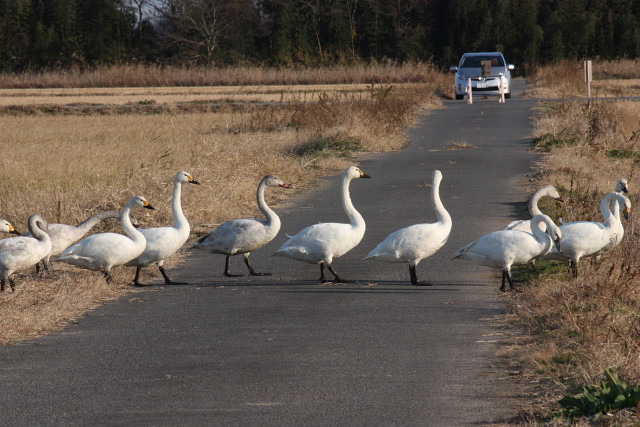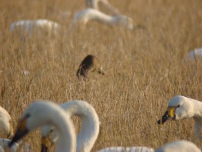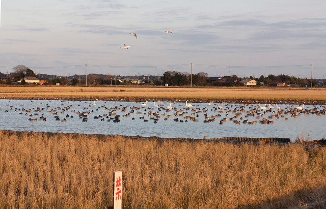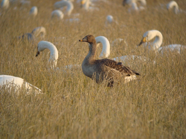「白鳥の郷」は、東京近郊で冬季1000羽を超えるコハクチョウが飛来する場所として有名ですが、今回はコハクチョウの群れに混じって1羽のオオヒシクイも見られました。