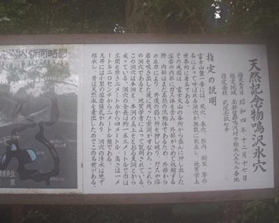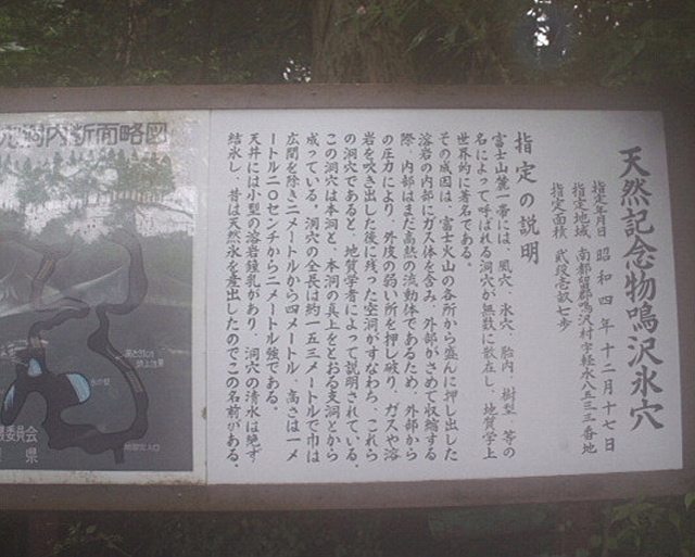 鳴沢氷穴は、山梨県南都留郡鳴沢村に立地する溶岩洞で、総延長156メートル、幅1.5~11メートル、高さ1~3.6メートル。1929年(昭和4年)12月17日に旧文部省により天然記念物に指定されたそうです。