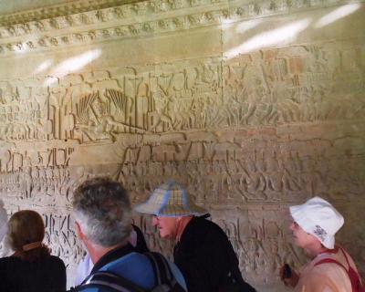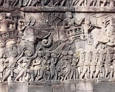 バイヨン寺院第一回廊のレリーフも、クメール軍の行進や戦闘シーン、民衆の生活まで多彩に渡っていて、解説を聞くと面白いです。