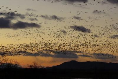 前回訪れた時は午後2時頃だったので、塒入りや朝の飛び立ちを見る事ができませんでしたが、今回はホテルに前泊して朝6時に出発したので、マガンの飛び立ちを見る事ができました。早朝6時35分、3万羽のマガンの群れが一斉に飛び立つ光景は、すさまじいというか迫力満点です。ぜひ、一生に一度は御自身で体験なさって下さい。- 旅行時期