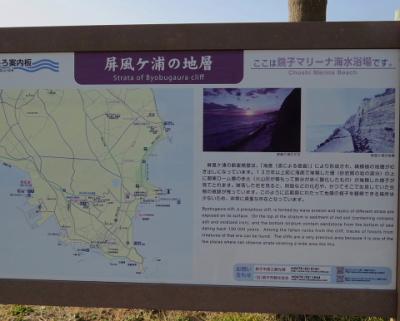 屏風ヶ浦は、関東名所100選にも入っている景勝地で、千葉県銚子市名洗町から旭市の刑部岬(ぎょうぶみさき)まで延々10kmにわたる海岸の絶壁(海抜40~50m)は、英仏海峡のドーバーの「白い壁」に匹敵するといわれ、「東洋のドーバー」とも呼ばれているそうです。屏風ヶ浦の真下には舗装された遊歩道があり歩きやすいです。ただし、理由がわかりませんが、遊歩道の途中で立入禁止になっている個所がありますので、その先には立入らないようにしましょう。ひょっとして、立入禁止区域は崖崩れの恐れがあるのかもしれません。