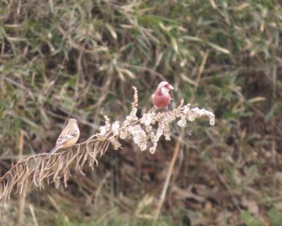 今回はベニマシコが番いで出てくれました。ベニマシコは珍鳥というほどではありませんが、平野部や都市部ではあまり見られない赤い鳥の代表選手です。