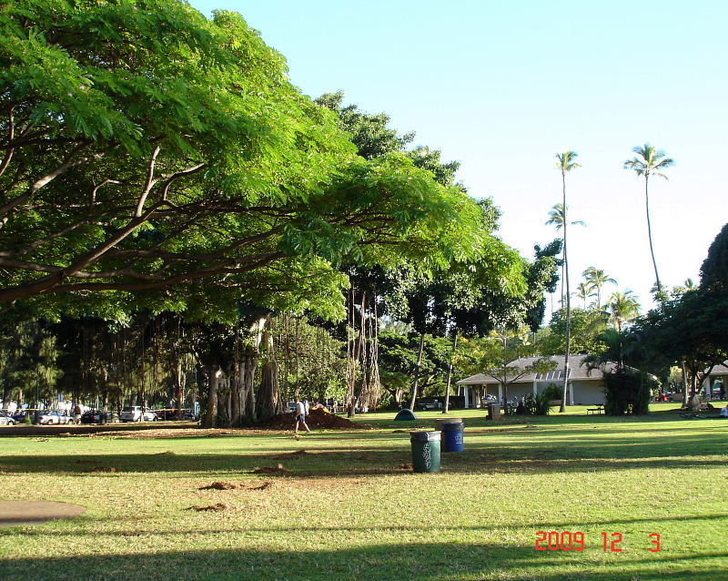 このカピオラニ公園でバードウォッチングを楽しみ、コウカンチョウを見ました。コウカンチョウはワイキキビーチでも見かけましたが、美しい鳥さんなので、再び会えて嬉しかったです。- 旅行時期