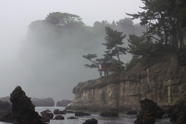 友人と一緒に、「茨城百景」石碑巡りの旅で北茨城市を訪れた時、幻想的に霧の中に見え隠れする「六角堂」を見ました。