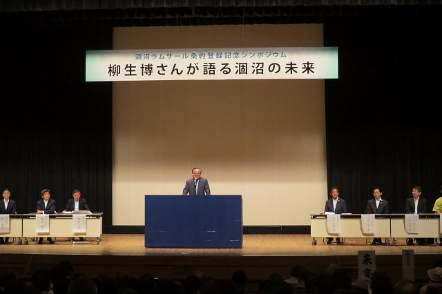 涸沼(ひぬま)自然公園でのヒヌマイトトンボ観察会終了後、涸沼の「ラムサール条約登録記念」の柳生博さんの講演会を見てきました。