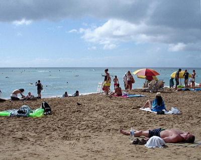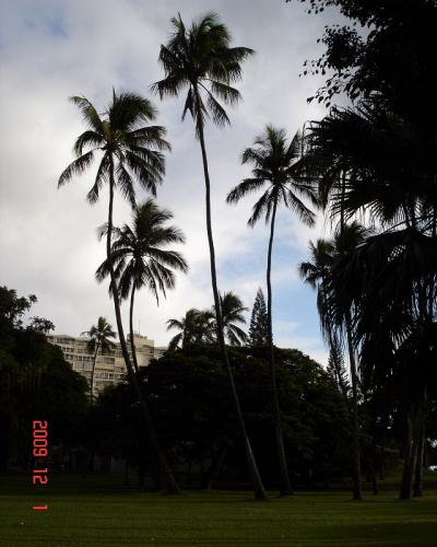 旅行社(てるみくらぶ)主催のオアフ島観光ツアーに参加してワイキキビーチを訪れた時、ビーチの隣の芝生でコウカンチョウを見てきました。