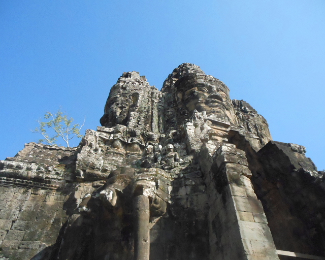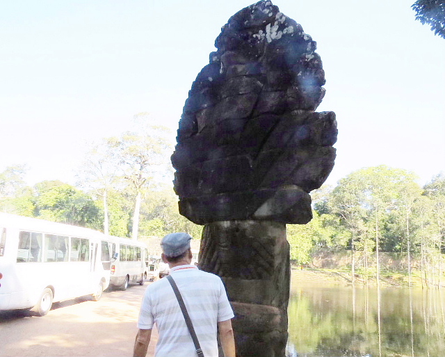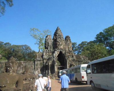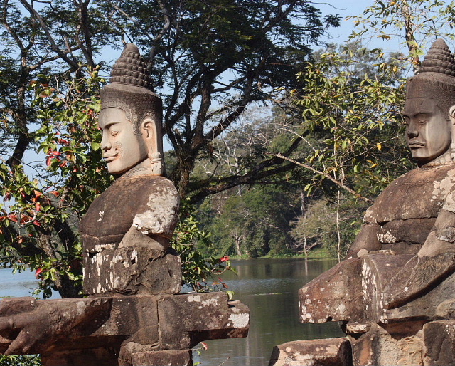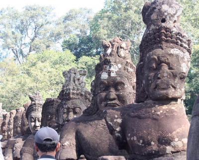 アンコールトムには、南大門、北大門、西大門、死者の門、勝利の門の5つの城門があるが破損が激しく、往時の姿を残すのは南大門のみだそうです。南大門前にある幅30mの濠を渡る橋の両側には、神々と阿修羅の像が両側に54体ずつ、合計108体も設置されています。南大門の上部の像は、四面観世音菩薩像だそうです。