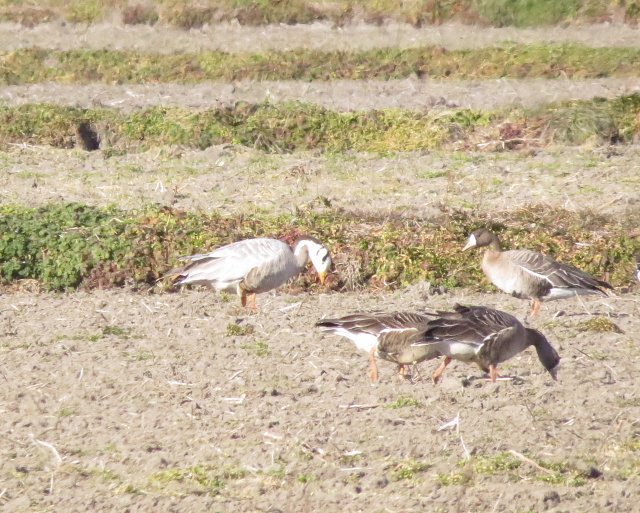 今回もインドガンは沼の中では見つからず、周辺の田圃でマガンの群れの中に入って休息していました。初めて見る鳥なので興奮しましたが、距離がちょっと遠すぎて写真の迫力がイマイチですが、証拠写真にはなると思います。