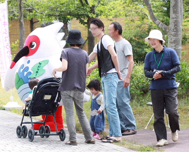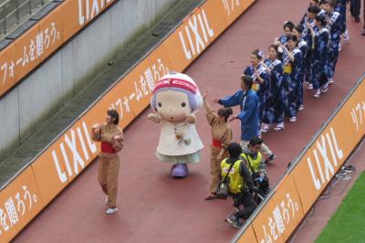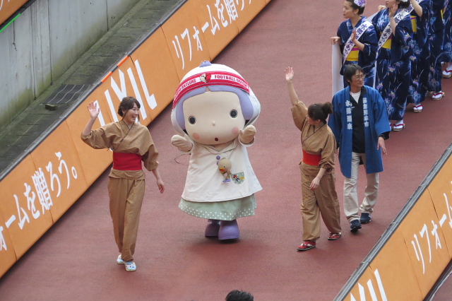 試合終了後、潮来市のゆるキャラ「あやめちゃん」が観客席に愛想を振りまいていました。- 旅行時期