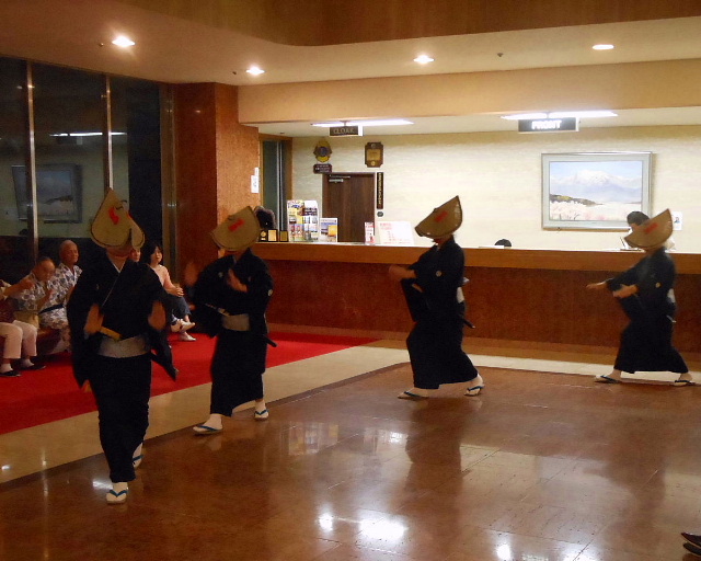ホテルに到着して、部屋で一息ついた頃、ロビーで民謡ショーがあるとの事で、みんなで見にいきました。浴衣姿の踊り子さんが交代で佐渡おけさを披露してくれました。- 旅行時期