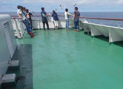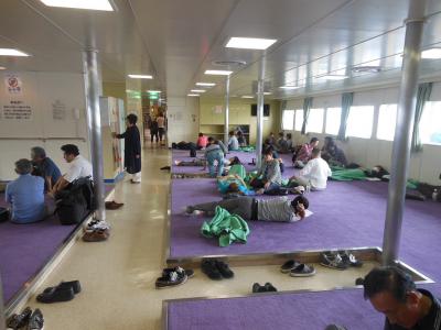 船内では、後部甲板でウミネコへの餌やりを見たり、風景を楽しみました。海風に当たって少し疲れたので、二等船室に降りて横になってくつろぎました。新潟港に着くまで、狭い観光バスに何時間も乗っていたので、横になってくつろぐ事ができ、とても良かったです。- 旅行時期