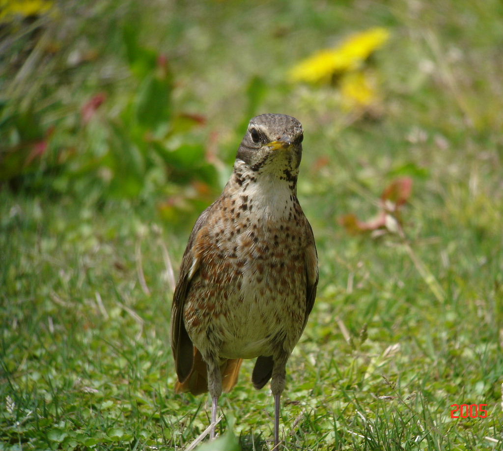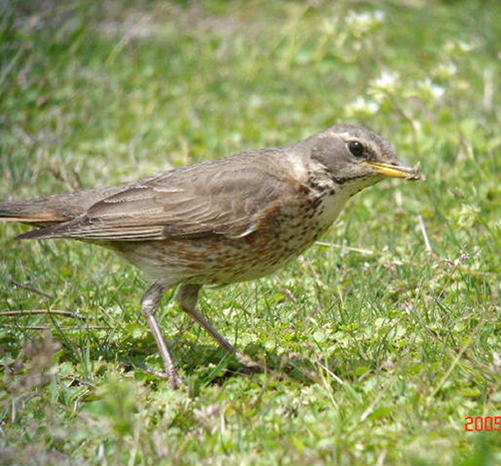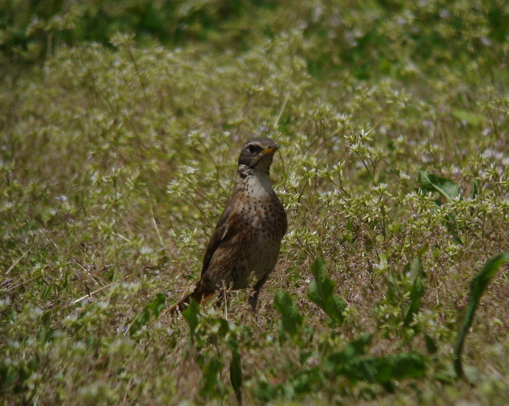 普通のツグミとの識別ポイントは、ツグミの胸の斑点は黒色ですが、ハチジョウツグミの胸の斑点は赤褐色なので、一度見ていると識別は容易です。