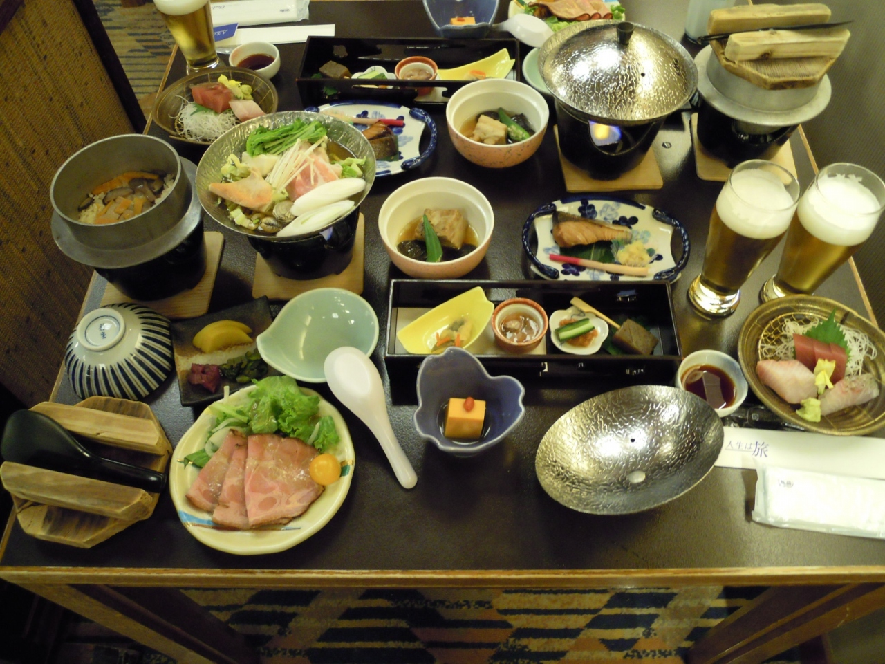 食事は基本バイキングだが、今回夕食は和食膳会席を予約、全12の品数を楽しめ、恒例のアルコール飲み放題、すっかり出来上がりました。