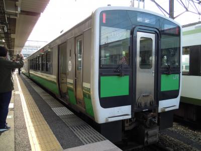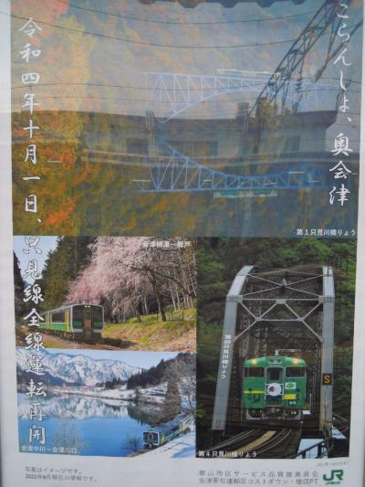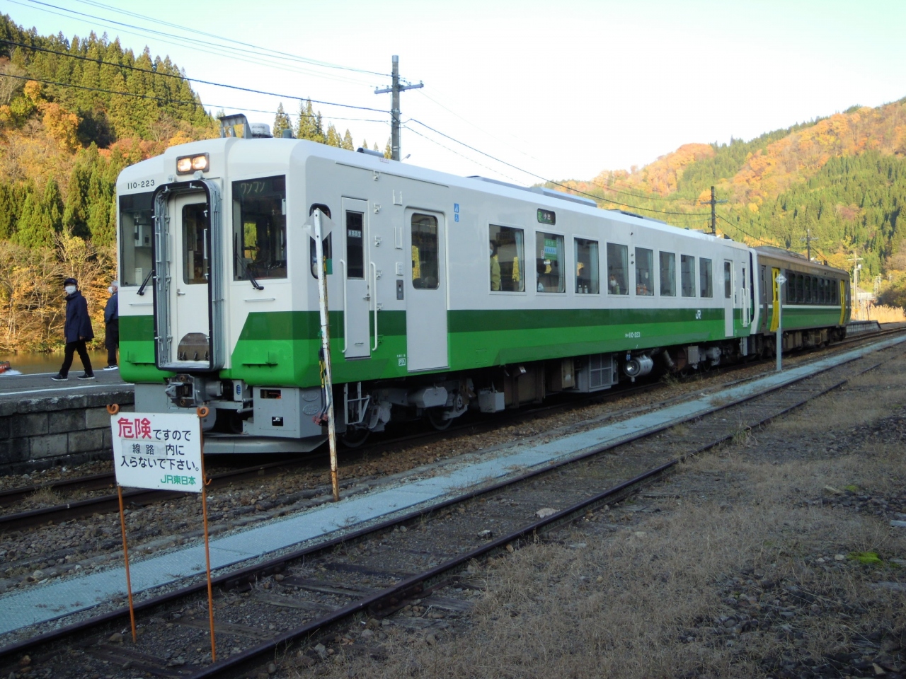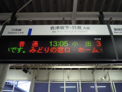 10/1に11年ぶりに完全復旧したこの路線に乗りたくて夫婦で利用しました。会津若松駅13:05発⇒小出着17:47(2両編成)、ホームには列車を待つ多くの観光客で賑わっていた。
