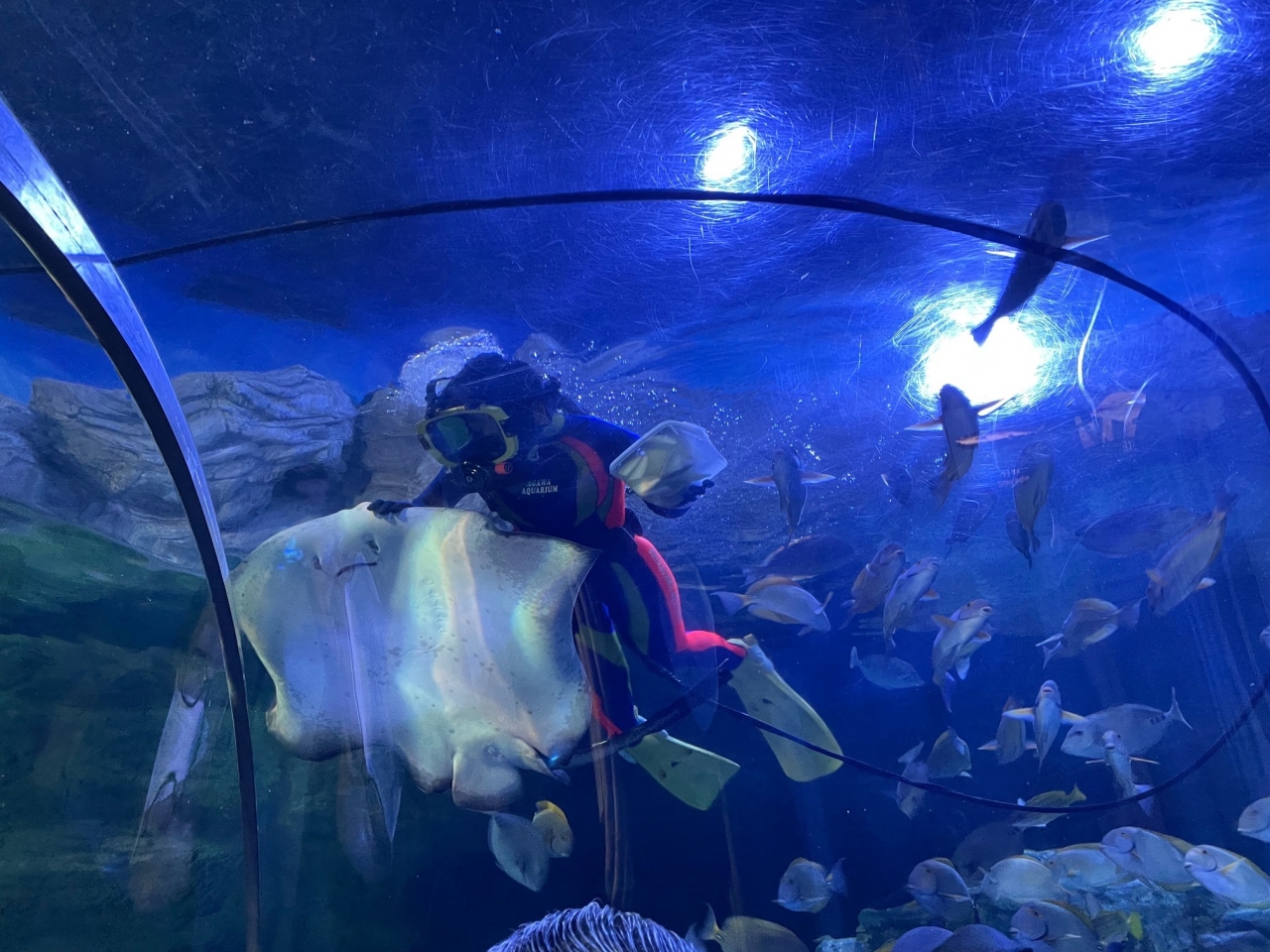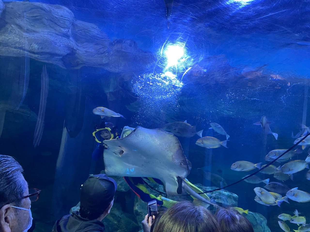 屋外ではイルカショーやアシカショーが楽しめ、屋内にはトンネル水槽で女性ダイバーが魚(特にエイ)への餌やりが見ものでした。その他多くの水槽の生き物たちを観察でき童心に返った気持ちになりました。- 旅行時期